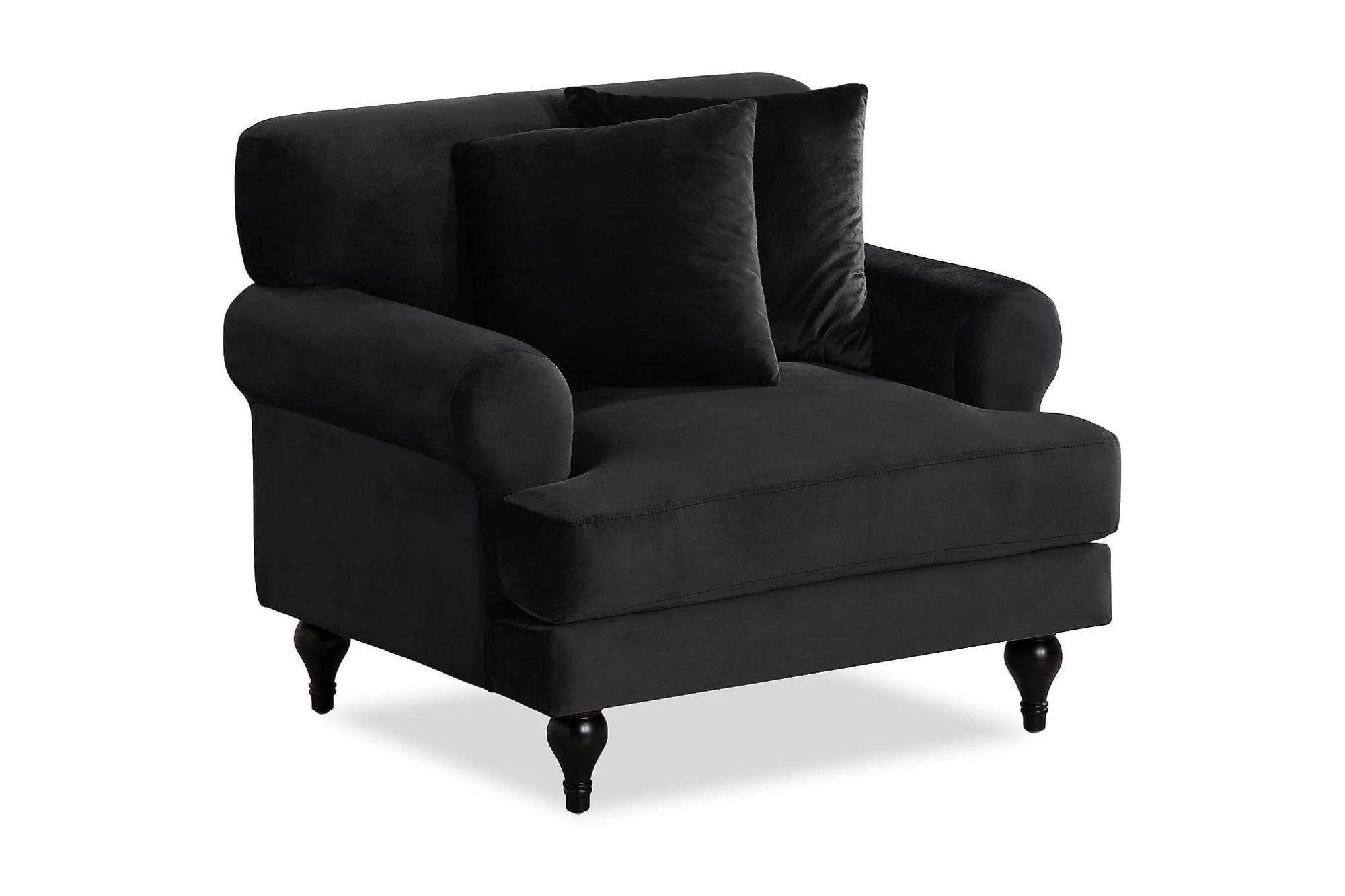 Amanda er en smuk lænestol med skøn komfort. Hvis du er ude efter en moderne lænestol som er lige så trendy, som den er komfortabel, så er Amanda det helt rigtige valg. Denne lænestol er klædt i sort, blød velour, som vil changere afhængig af, hvordan lys