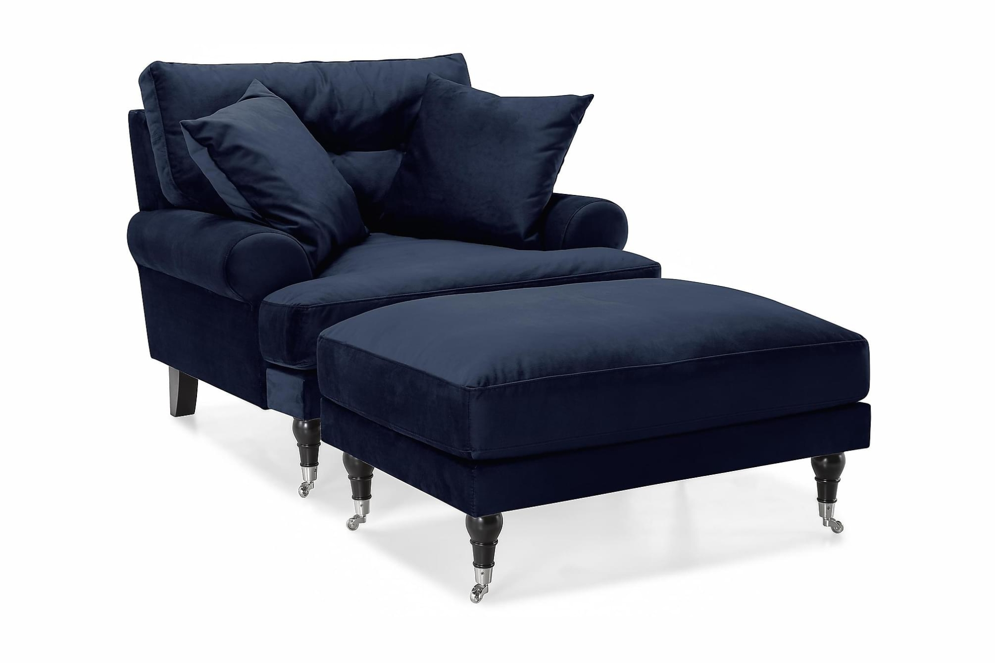 Andrew er en skøn og komfortabel lænestol i blød velour, som vil være et smukt indslag i dit hjem. Lænestolen fås med en tilhørende puf, som fuldender udtrykket og gør siddekomforten ekstra god. Den har stilfulde og gennemførte detaljer som messinghjul og