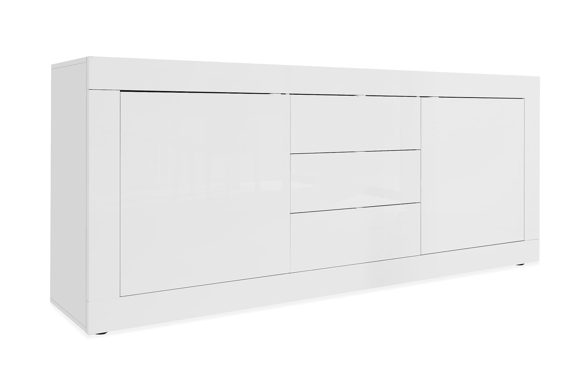 Basic skænk er en moderne og elegant skænk, som både tilbyder god opbevaringsplads og et stilfuldt design. Døre og skuffer har små håndtag i metal, der smukt smelter ind i designet. Skænken har højglanslak samt to skabe og tre skuffer. I hvert skab findes