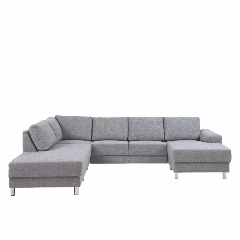Calverton U-sofaen er betrukket i groft lysgrå møbelstof. En stor sofa med plads