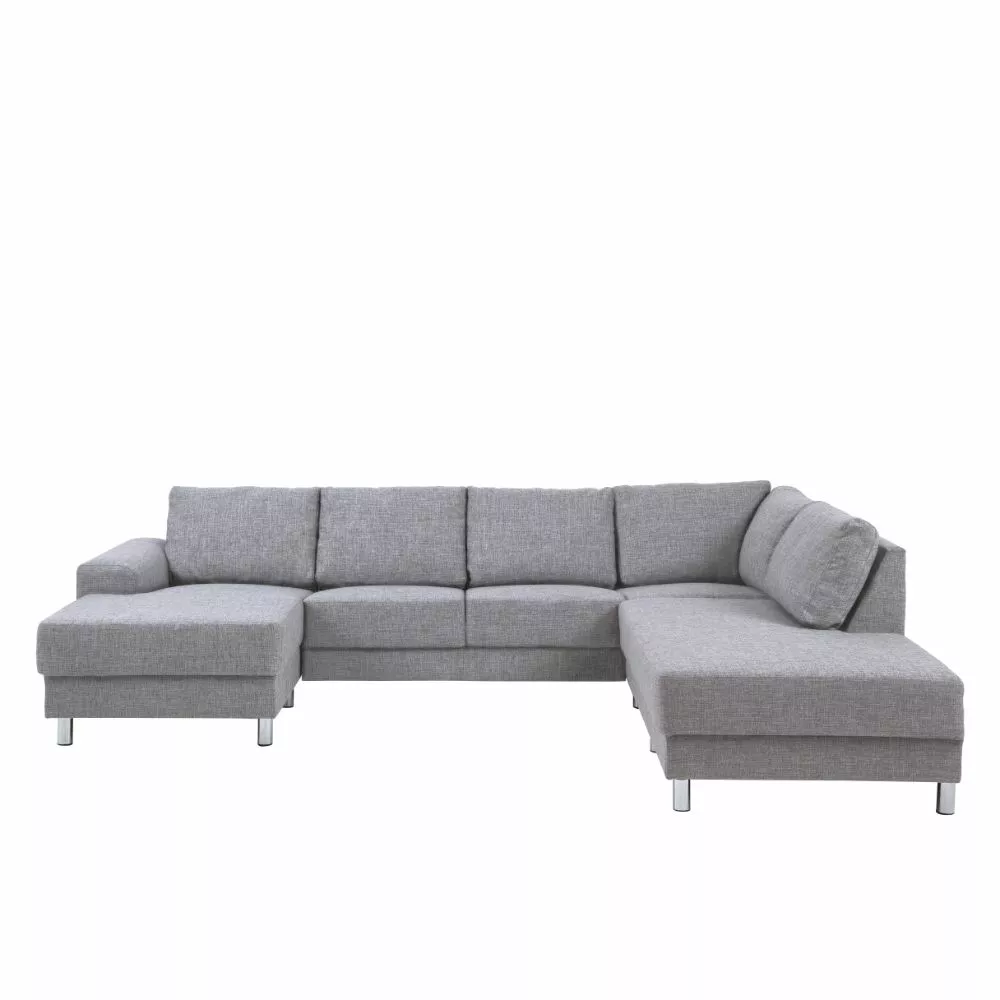 Calverton U-sofaen er betrukket i groft lysgrå møbelstof. En stor sofa med plads