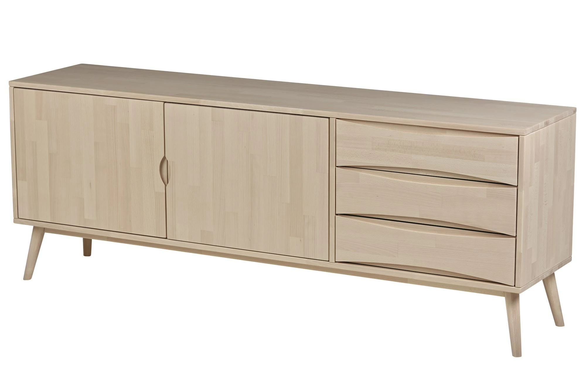 På grund af varens størrelse anbefaler vi, at du vælger hjemmelevering. Skænk i massiv hvidolieret bøg med tre skuffer og to låger, hvor der er hylder bag. Grebene på lågerne og skufferne er udfræset og flot afrundet. Skænken måler 75 cm i højden, 45,5 cm