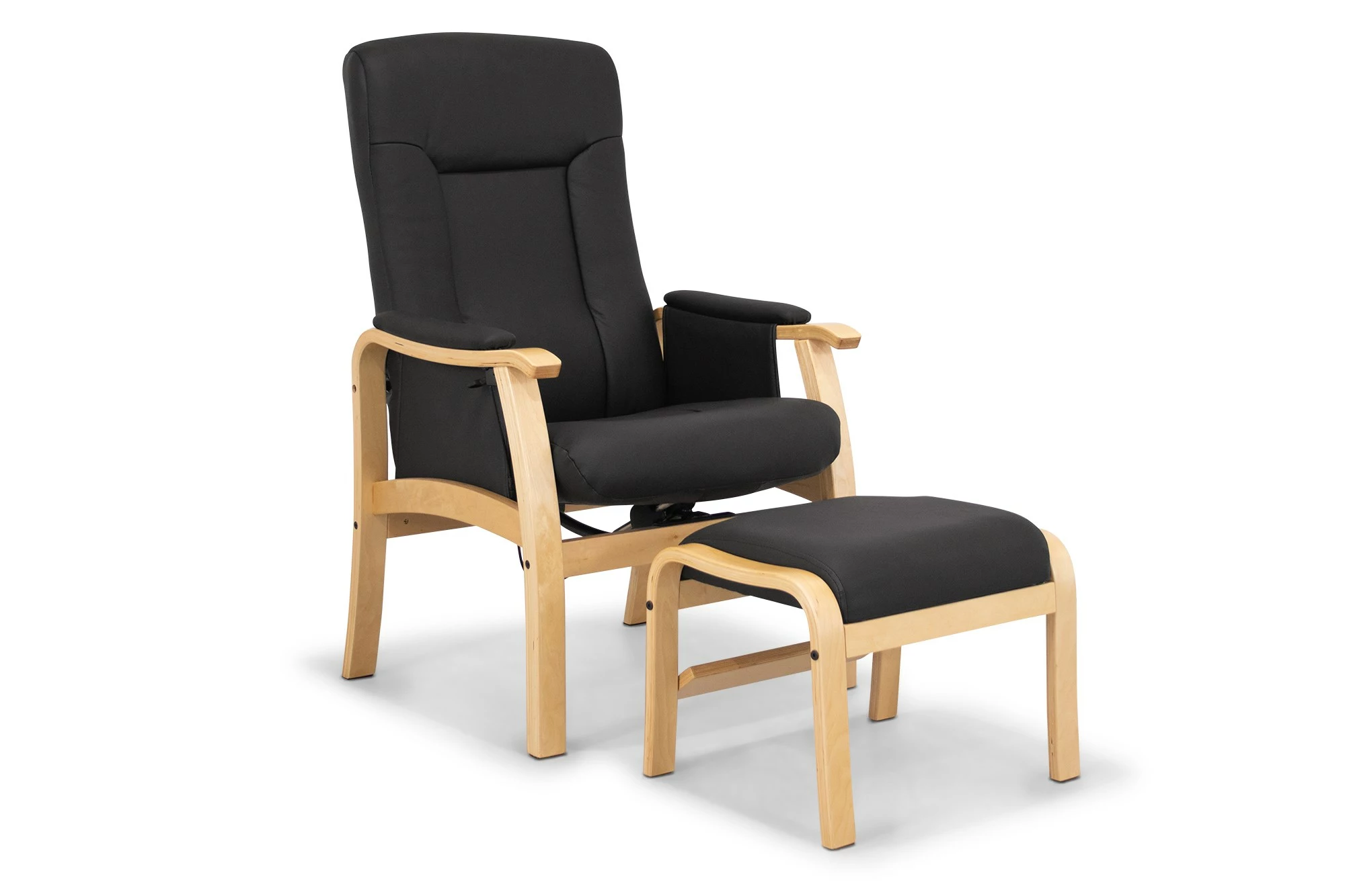 Otiumstol, lænestol eller hvilestol – kært barn har mange navne. Vores bud på en super lækker otiumstol er denne fra Dragør-serien. Lænestolen er inkl. fodskammel og med trinløs regulering af ryggen. Stolen er monteret med sort bøffellæder på alle slidfla