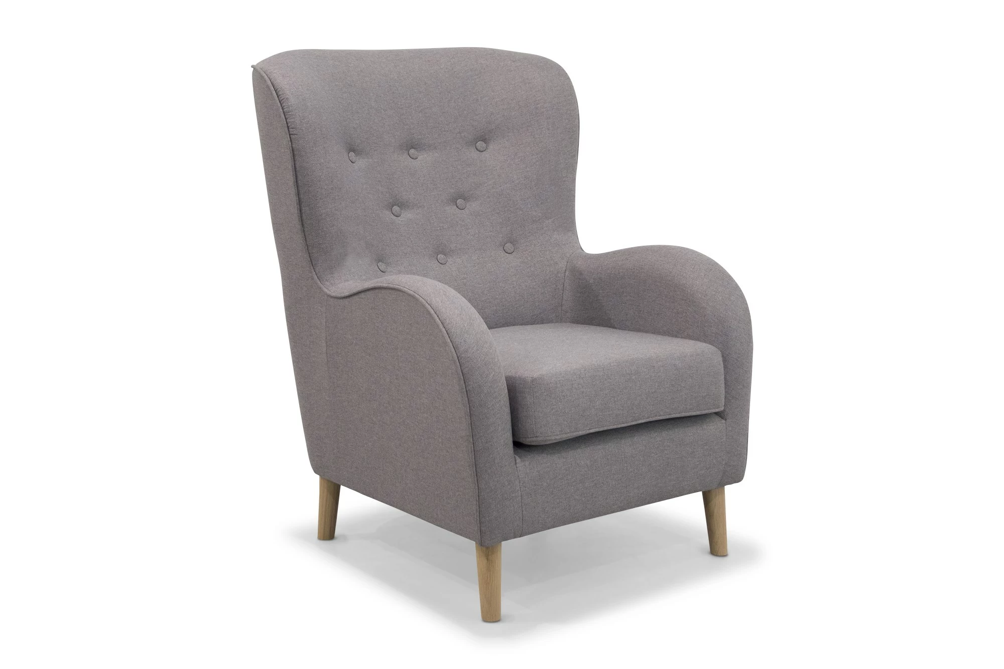 Flot klassisk lænestol monteret med gråt stof og ben i massiv træ. Stolen måler 100 cm i højden, 88 cm i dybden og er 78 cm lang. Du finder resten af King-serien her. Vedligeholdelse: Husk at møbler skal plejes og vedligeholdes for at sikre længst mulig l