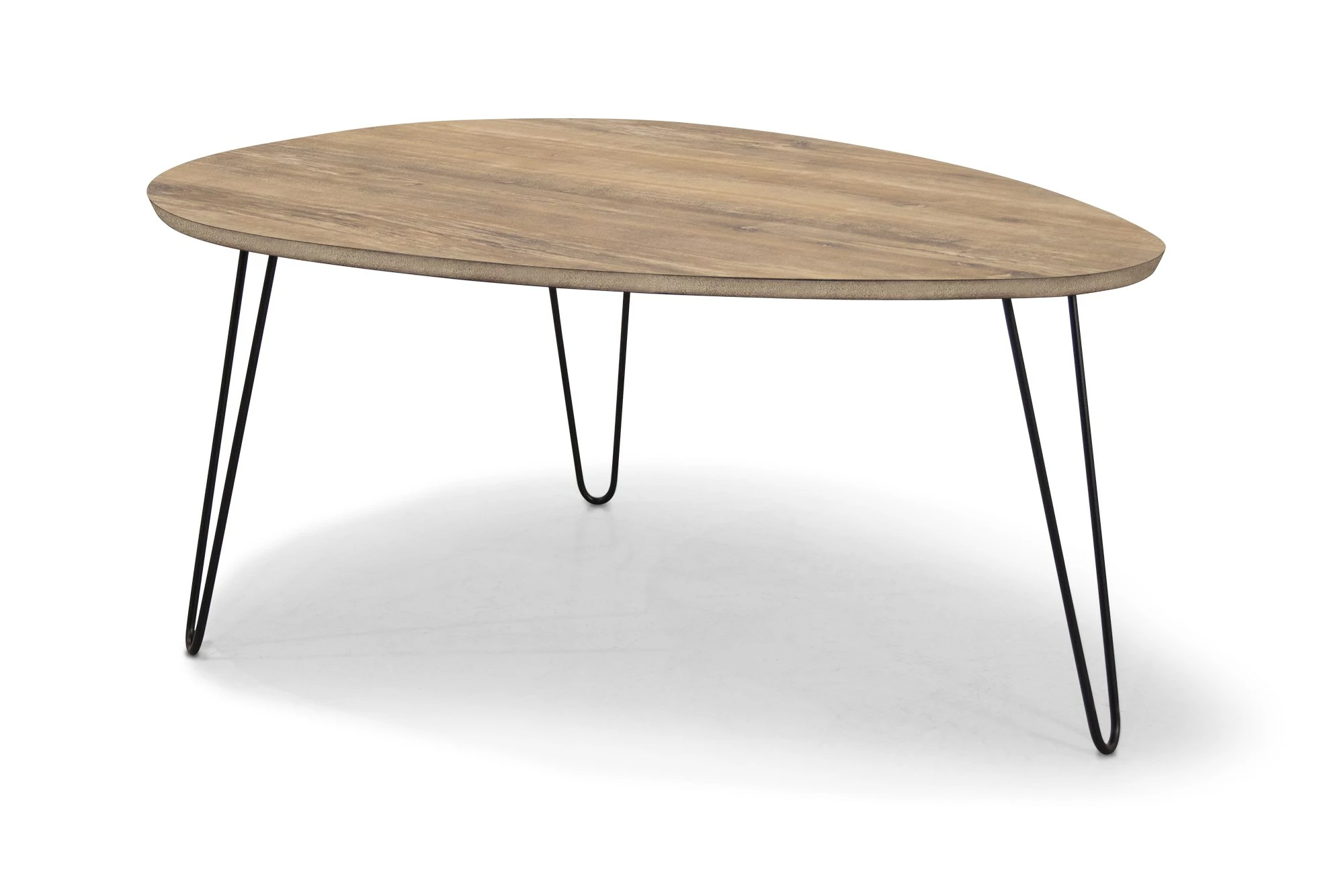 Dråbeformet sofabord med bordplade i rustikt vildegelook. Bordet er højtrykslamineret og med sorlakeret metalben. Sofabordet måler 48 cm i højden, 80 cm i dybden og 110 cm i længden. Se alle vores sofaborde her. Husk at møbler skal plejes og vedligeholdes
