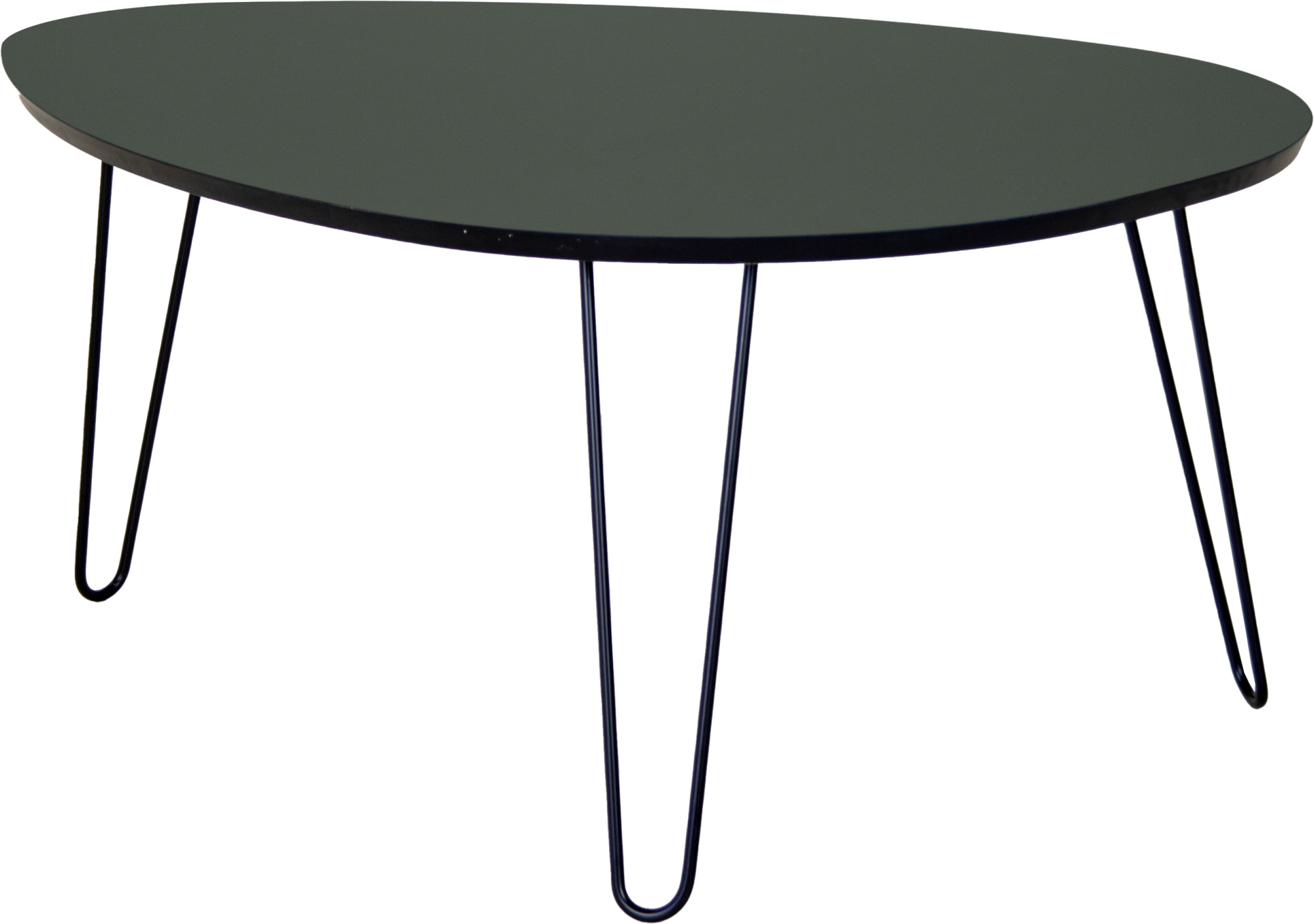 Dråbeformet sofabord med bordplade i grøn. Højtrykslamineret og med sortlakerede metalben.