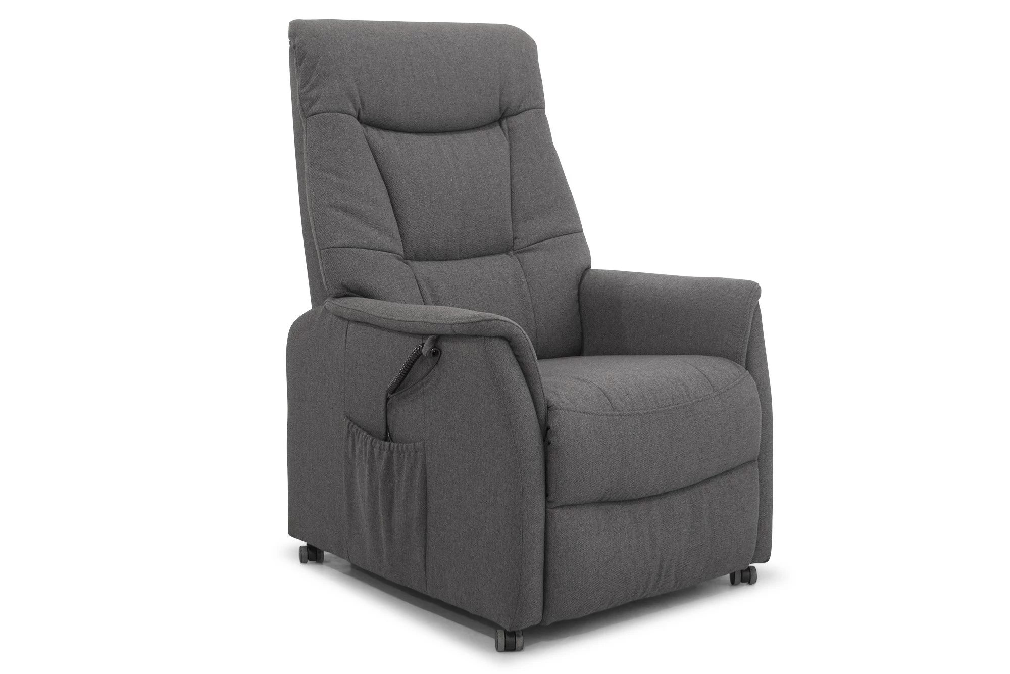 Lænestol monteret med antracitfarvet stof. Der er indbygget fodstøtte, regulerbar ryg, manuel nakkeregulering og udstigningshjælp. Stolen er med elfunktion med én motor. Betjeningspanelet er monteret i højre side. Sidst, men ikke mindst, så er lænestolen