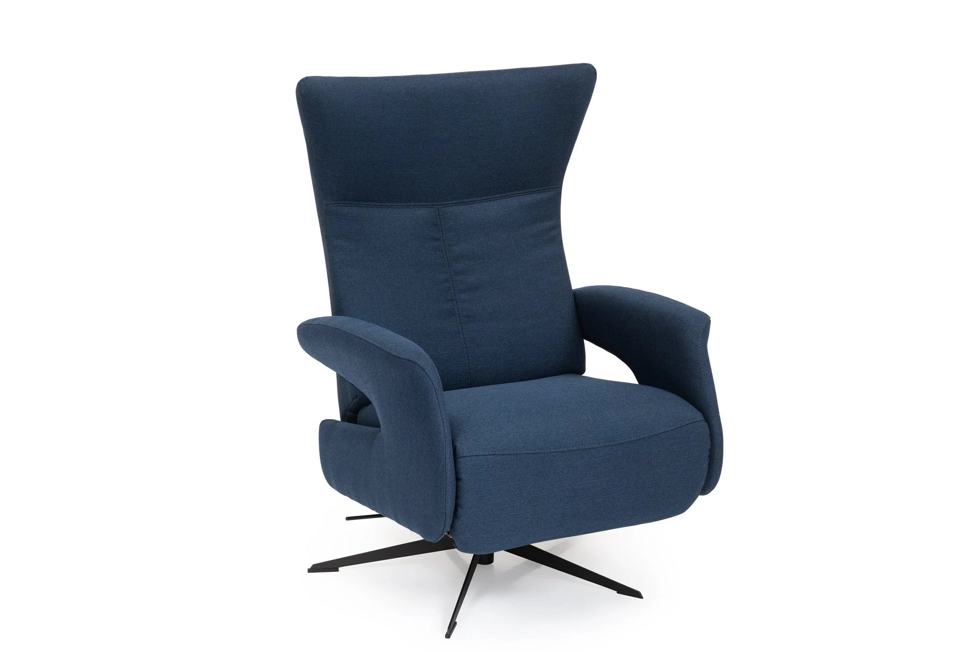 Leder du efter en lænestol, hvor du kan slappe helt af, og hvor du får komfort i topklasse? Så er du landet det rette sted. Denne lænestol er betrukket i mørkeblåt stof og har en integreret fodskammel, som nemt betjenes med et håndtag. Stolen er monteret
