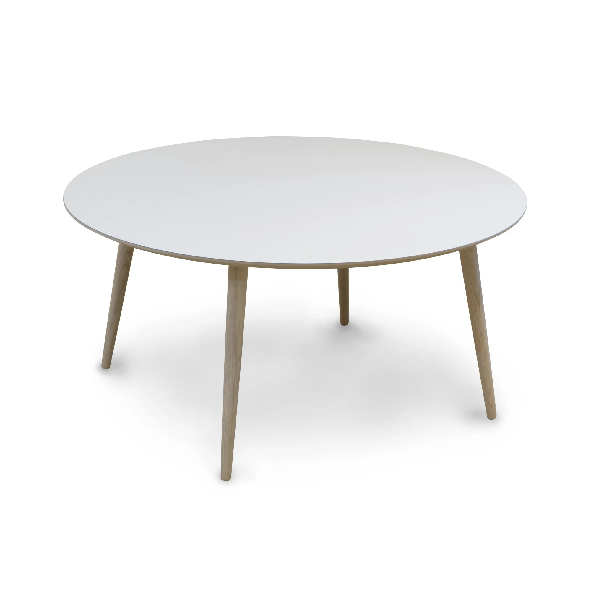 FSC®-certificeret produkt Mærket med det lille træ er din garanti for, at det anvendte træ stammer fra skove, der drives bæredygtigt. Du kan derfor nyde møblet med god samvittighed. Flot rundt sofabord i hvid højtrykslaminat med massive egetræsben i et t