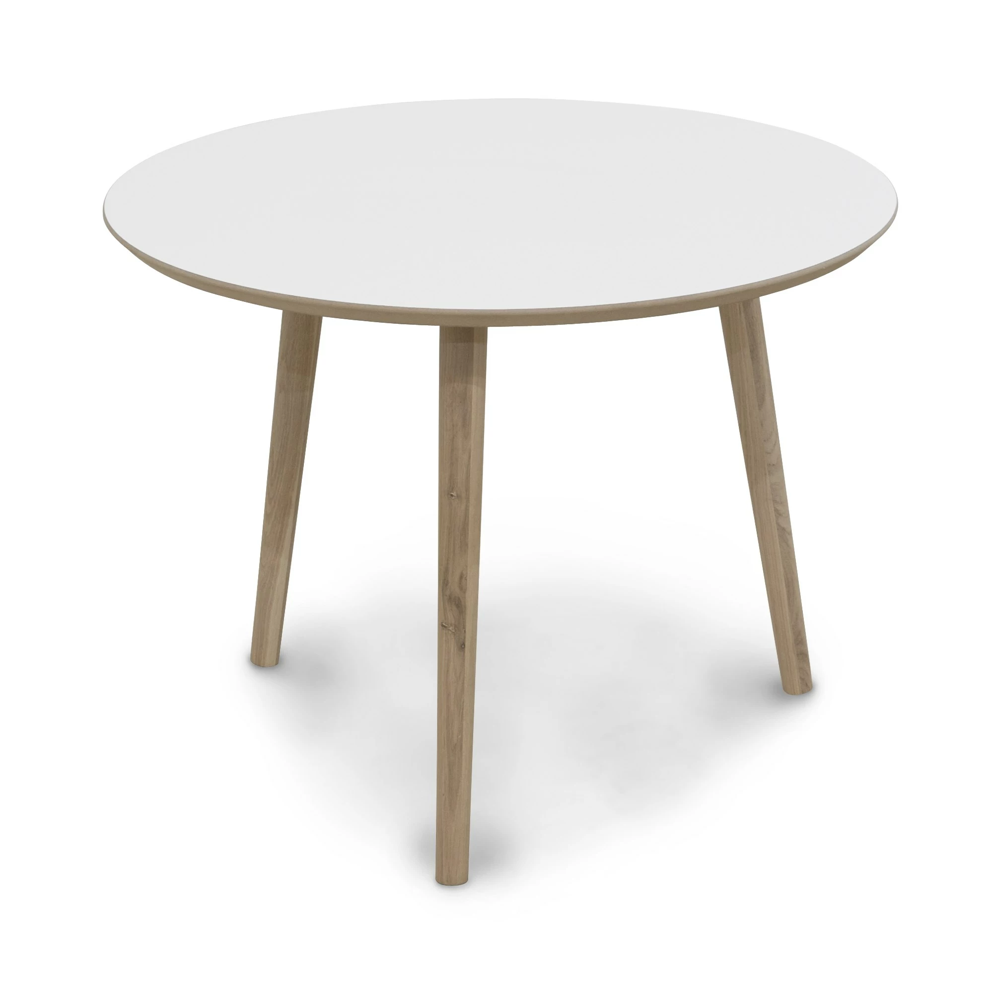 Flot rundt sofabord i hvid højtrykslaminat med massive egetræsben i et trendy design. Sofabordet vil passe ind i stort set alle hjem uanset stil og farvevalg. Bordet måler 47 cm i højden, 55 cm i dybden og 55 cm i længden. Mikado-serien fås i flere modell