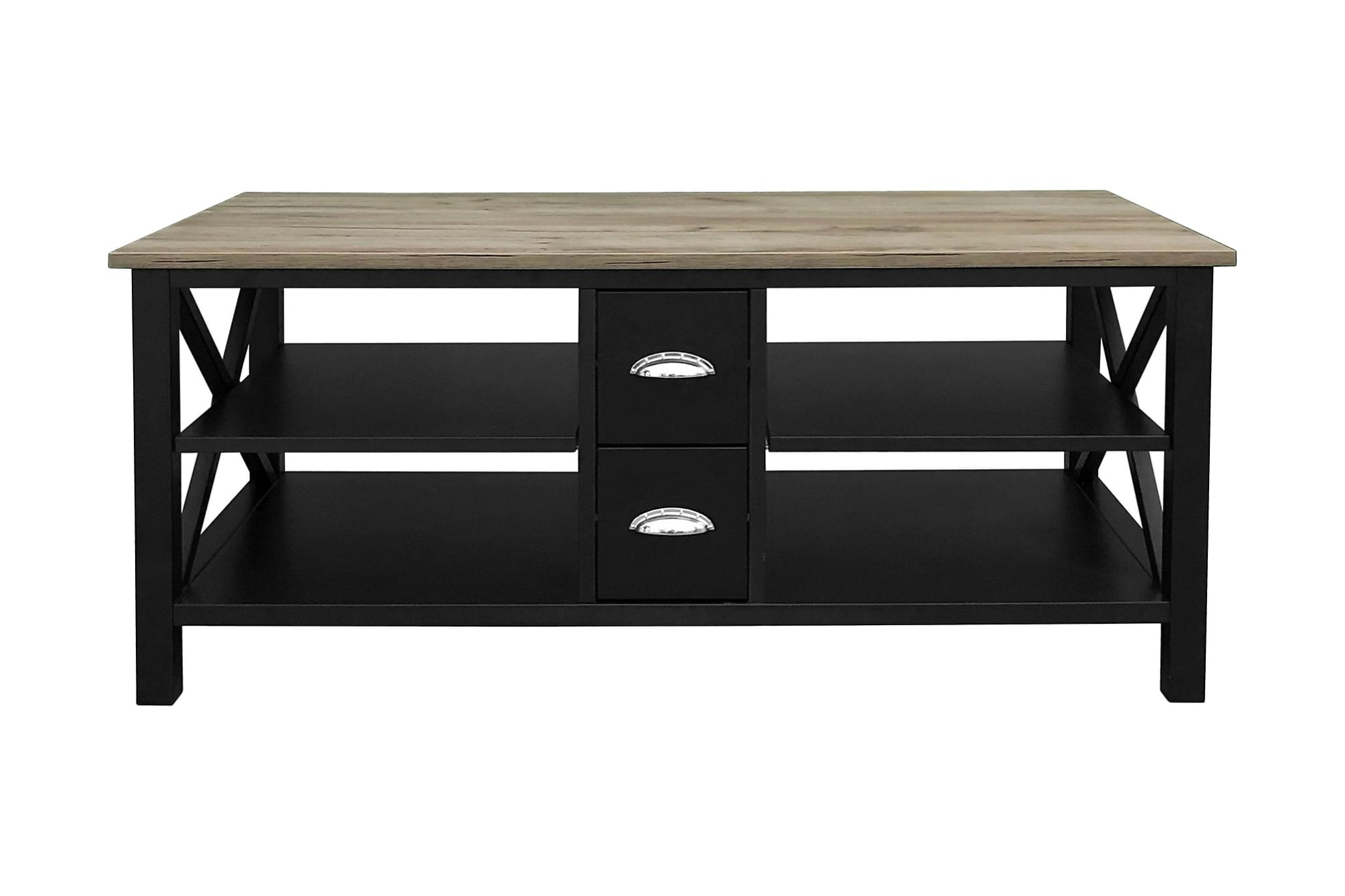 Mikael sofabord med skuffer har et klassisk design med et moderne præg. Bordet har praktiske hylder og en lysegrå bordplade i beton-mønstret laminat. Smukke detaljer, bl.a forkromede beslag og dekorative kryds i enderne, fuldender helhedsindtrykket af det