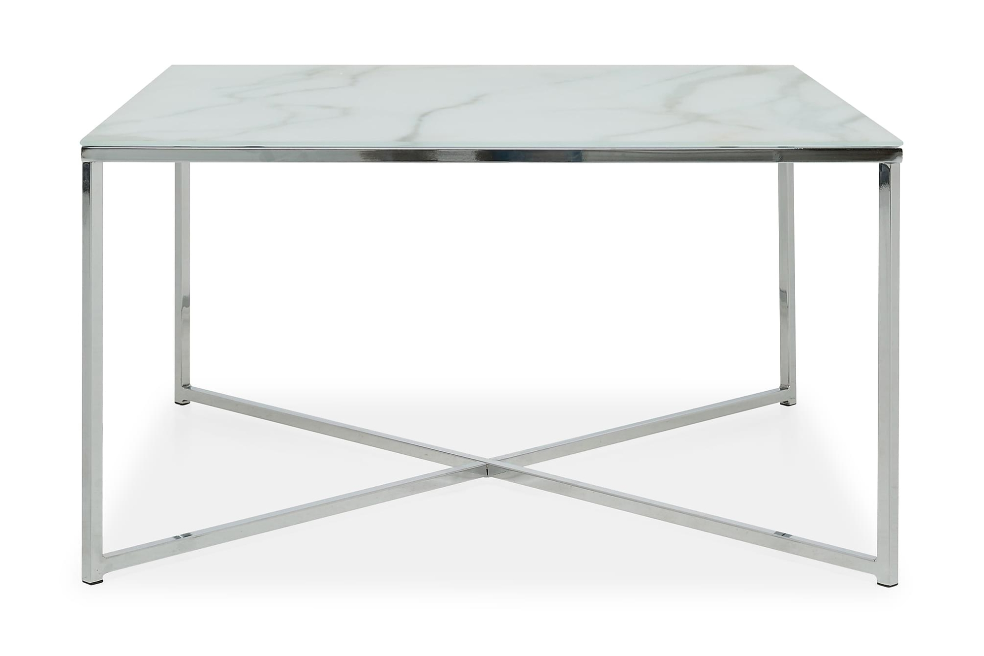 Nelly sofabord i elegant minimalistisk stil. Bordet har en bordplade i marmormønstret glas og stel af krom, en tidsløs og smuk kombination. Sofabordet har et let design som gør, at bordet passer både til store og små rum. Se alle vores sofaborde her. Vedl