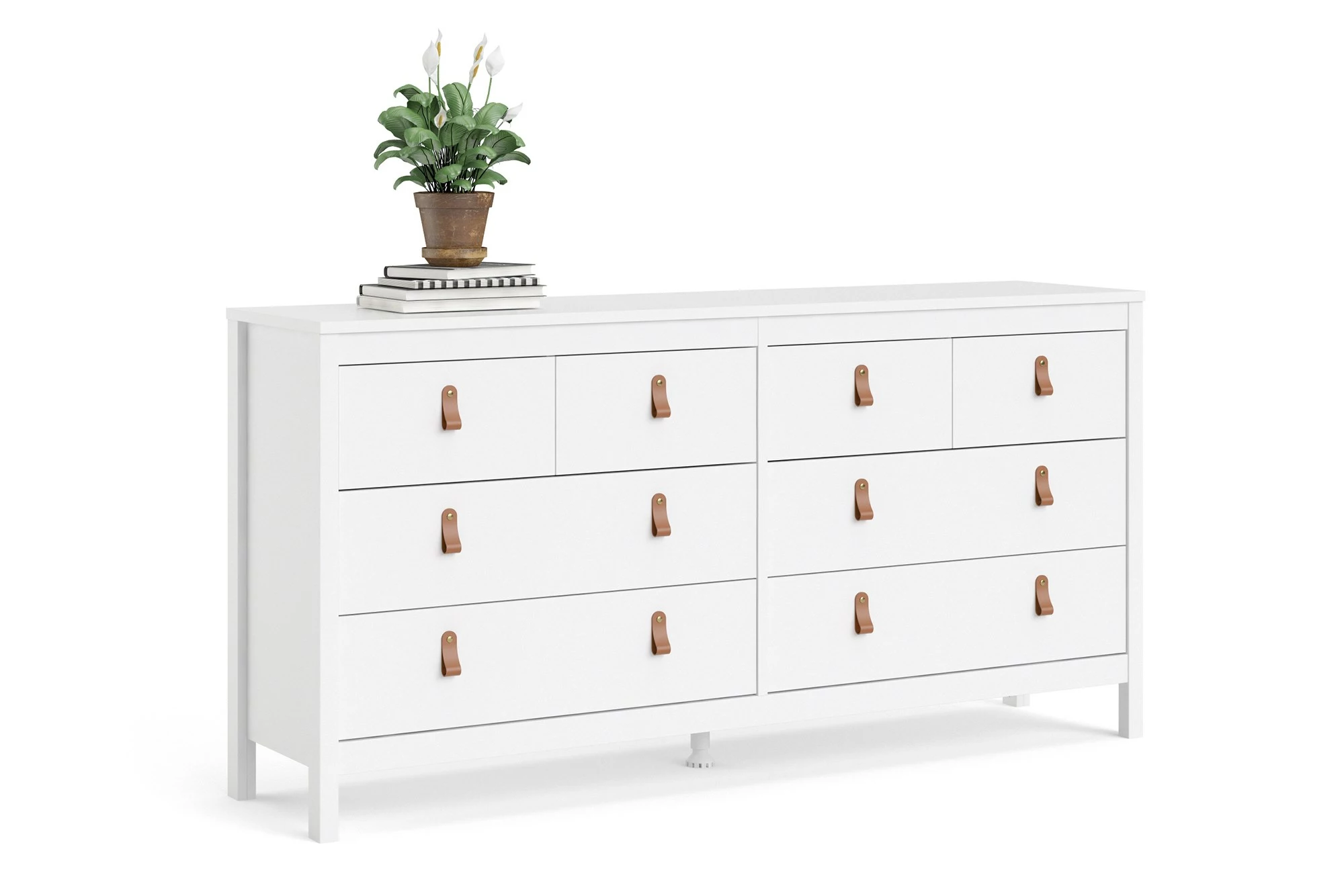 Lækker dobbeltkommode med otte skuffer i hvid folie. Der medfølger to sæt greb – et sæt i stål og et sæt i læder. Kommoden har en højde på 80 cm, en dybde på 38 cm og en længde på 159 cm. Benene måler 10 cm. Se hele vores Sofia-serie her. Vedligeholdelse