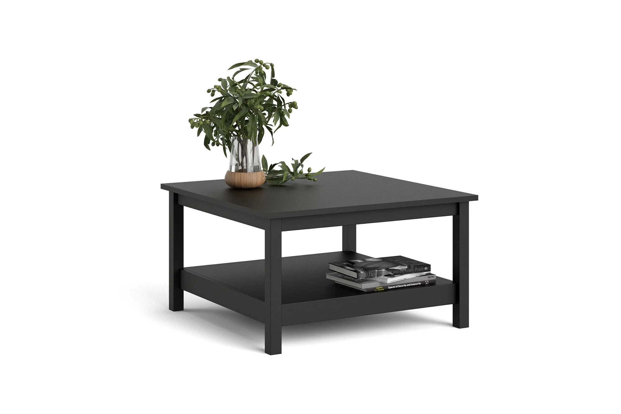 Lækkert og enkelt sofabord i sort folie med hylde. Sofabordet har en højde på 45 cm, en dybde på 81 cm og en længde på 81 cm. Benene måler 10 cm. Se hele vores Sofia-serie her. Vedligeholdelse Husk at møbler skal plejes og vedligeholdes for at sikre længs
