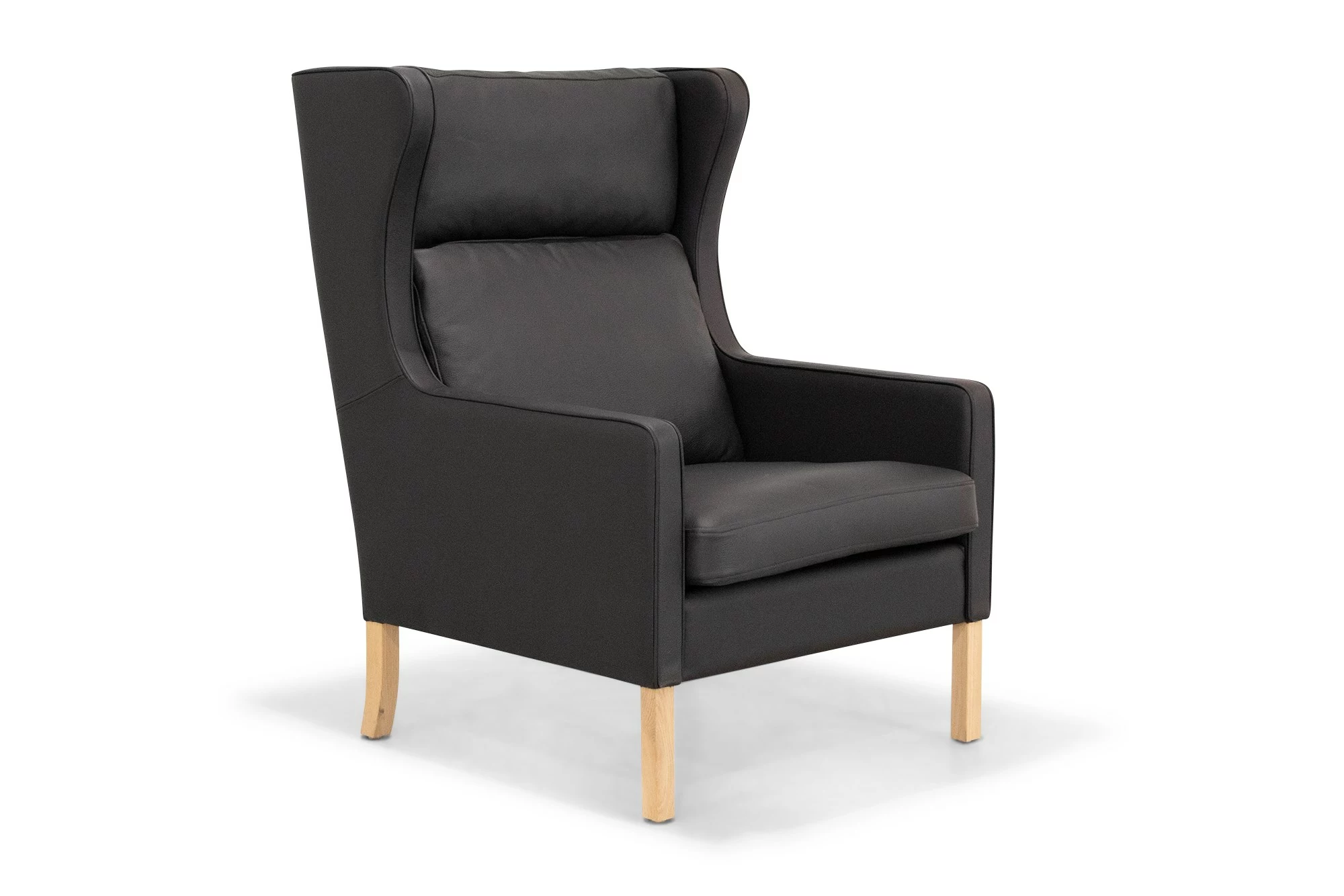 Flot, stilren og elegant øreklapstol som er monteret med sort okselæder på alle slidflader. De øvrige dele af øreklapstolen er i bonded læder, og benene er fremstillet i massiv egetræ. Stolen har en utrolig god siddekomfort, og med dens minimalistiske udt