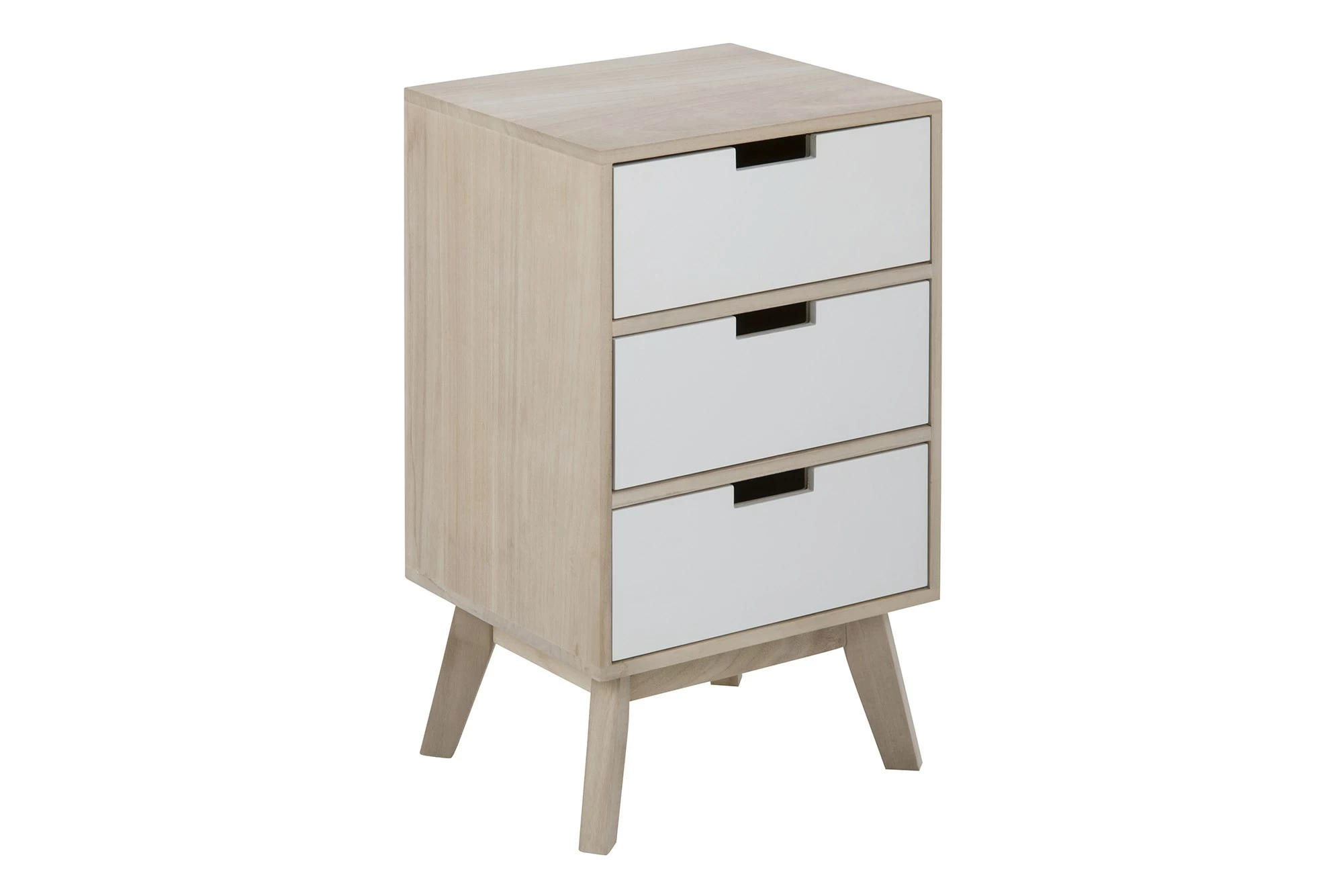 Smart lille tre-skuffers kommode/sengebord i ubehandlet paulownia træ med massive ben. De hvide skuffer er produceret i MDF. Kommoden/sengebordet måler 59,4 cm i højden, 30 cm i dybden og 35 cm i længden. Møblet findes også med tre og seks skuffer. Se ser