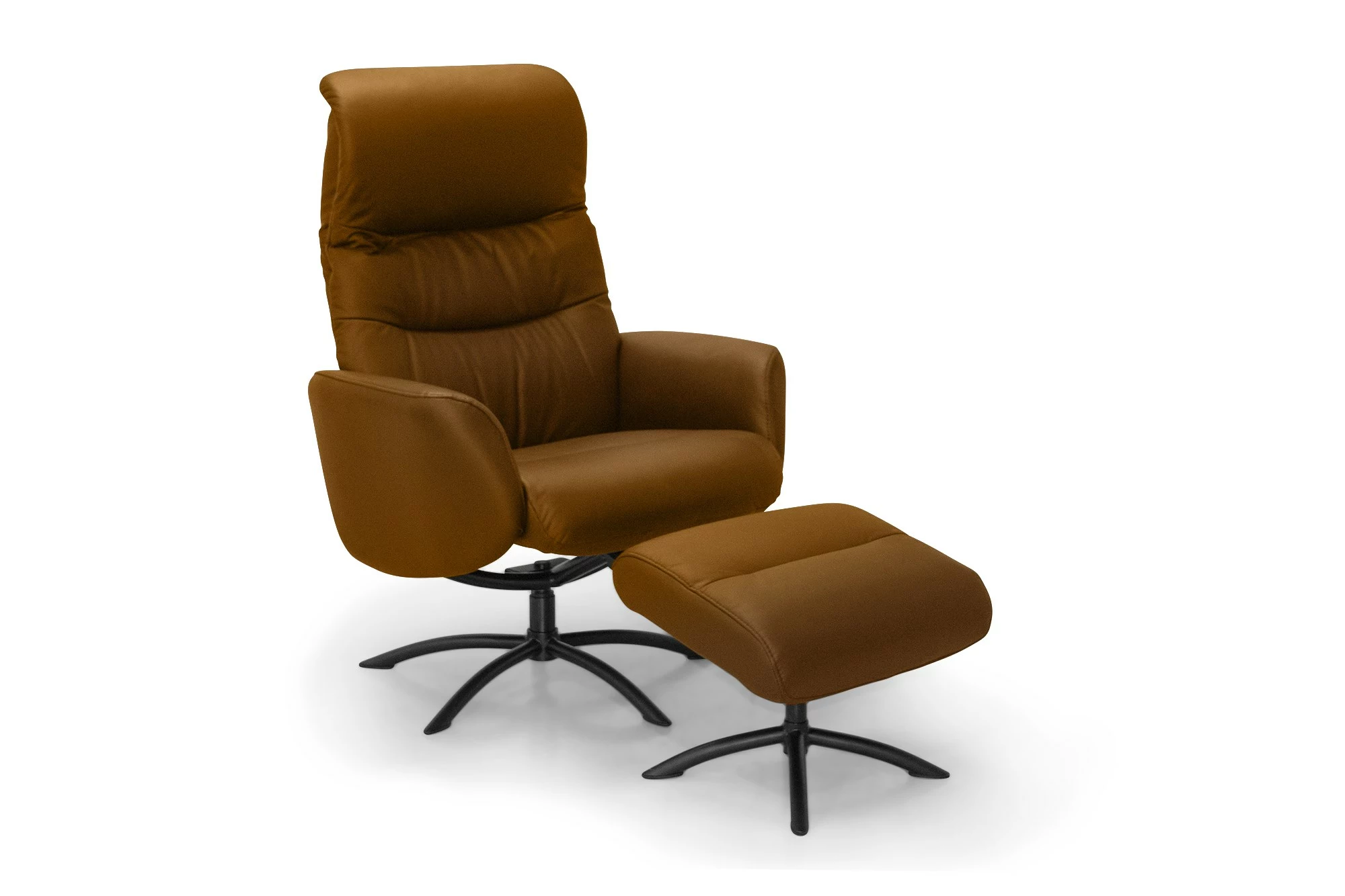 Højrygget lænestol med fodskammel monteret med cognacfarvet okselæder på alle slidflader. Derudover er stolen med sortlakeret drejesokkel. Lænestolen er med trinløs og regulerbar ryg og med justerbar nakkefunktion. Se alle lænestole her. Vedligeholdelse H