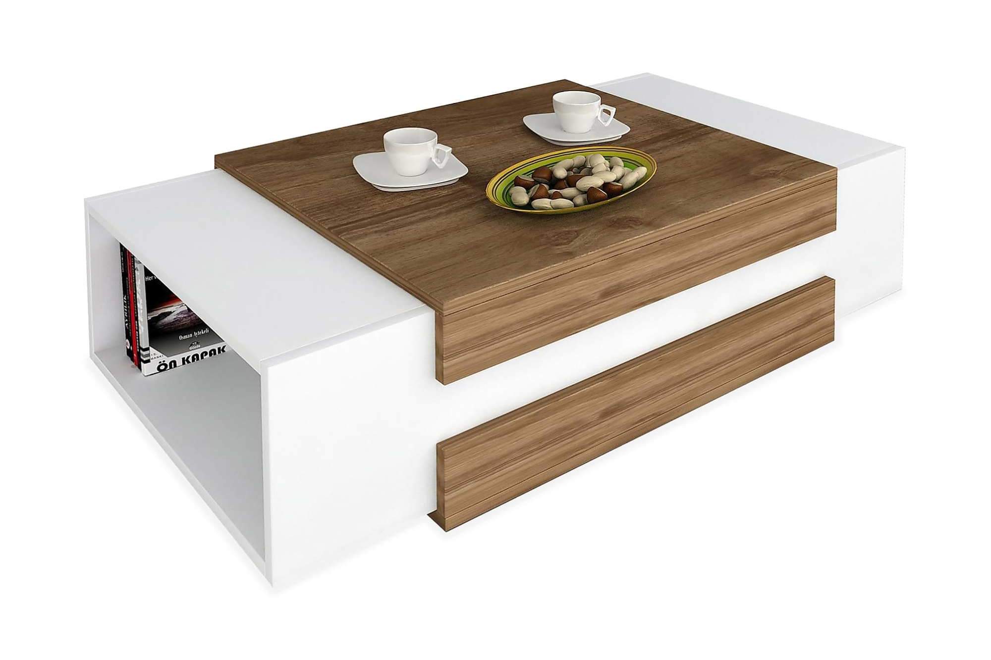 Stilren, moderne og tidsløs sofabord som passer ind i næsten ethvert hjem. Det hvide bord i kombination med valnødde-pladen giver et eksklusivt udtryk, hvilket også gør det nemt at pynte. Sofabordet har opbevaringsrum i siderne, hvor du bl.a. kan stille b